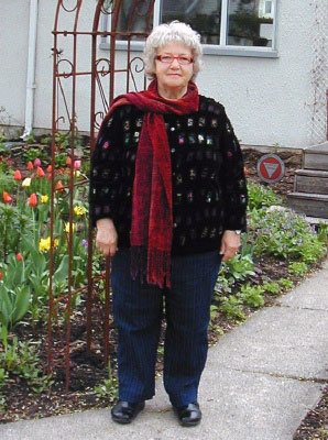 | Aganetha Dyck upon receiving a hand-woven scarf from Annabel. "Wow! What a smart looking woman with that gorgeous designer scarf," is what people will comment as they seem my very own Annabel scarf that matches my glasses. They will wonder, "From where does such a work of wonder appear?" And I will say, "From just before the other side, just before the place where soon a beautiful soul floats along weaving the heavens with a warp of kindness and a weft of goodness. Watch the sheep like clouds as they pass over and see a wisp of integrity above, a source of friendship. Others will smile at all the wisdom from the angel who now lives and once lived a life worth living, a life filled with sunny days and children smiling around her, with friends below soon missing the angel but knowing they are being contacted.Vibes of hope and gladness everywhere. Memories all around. |