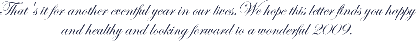 Winter came early again this year, with snow by mid-November and the local ski hill opening on December 5. We've already shovelled many centimetres and will run out of places to pile the stuff even earlier than usual. You might think that an early snow would encourage us to be more organized in advance of the holidays, however we are more inclined to go skiing instead and we've already been out several times. Last year, we had a major thaw in December and almost wound up with a semi-green Christmas despite the early snowfall. I don't think we are in any danger this year! But down to business. As is our usual custom, we'd like to share our year with you, friends and family, who are important to us. And we hope that we will be hearing from you with news and photos we can enjoy over a hot mulled wine after an afternoon on the trails. : : 2008 Highlights : :