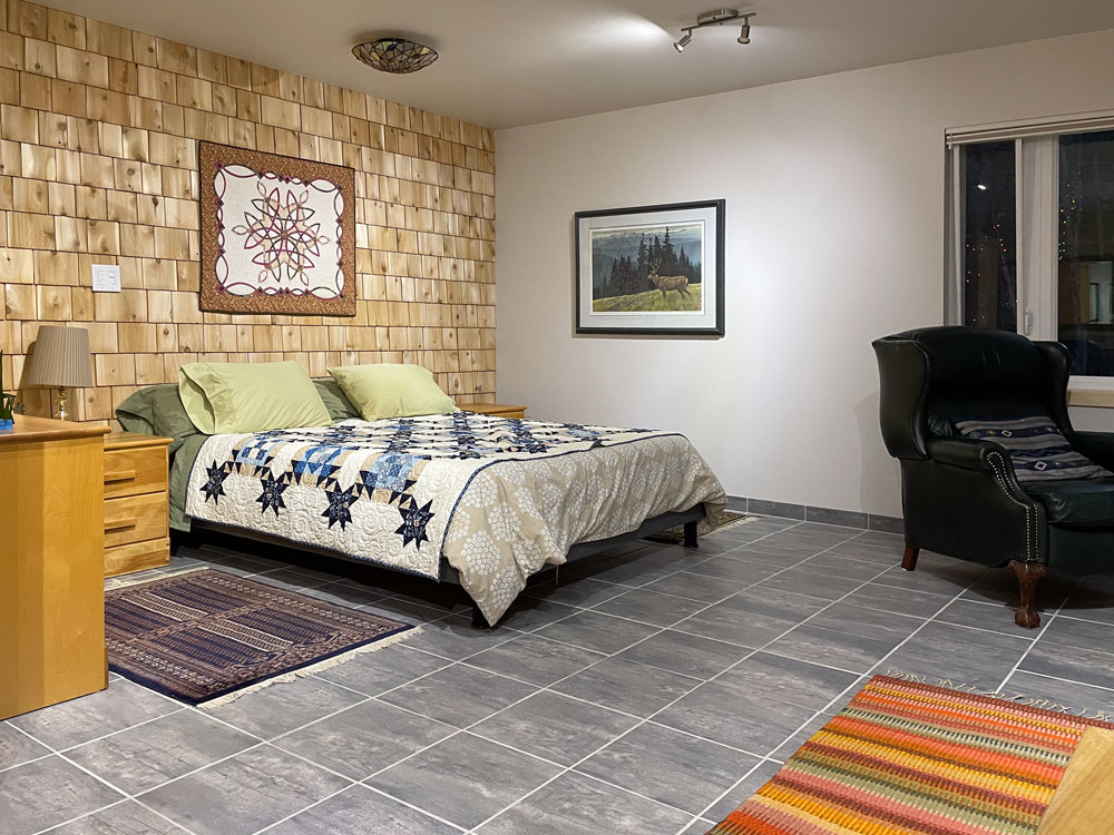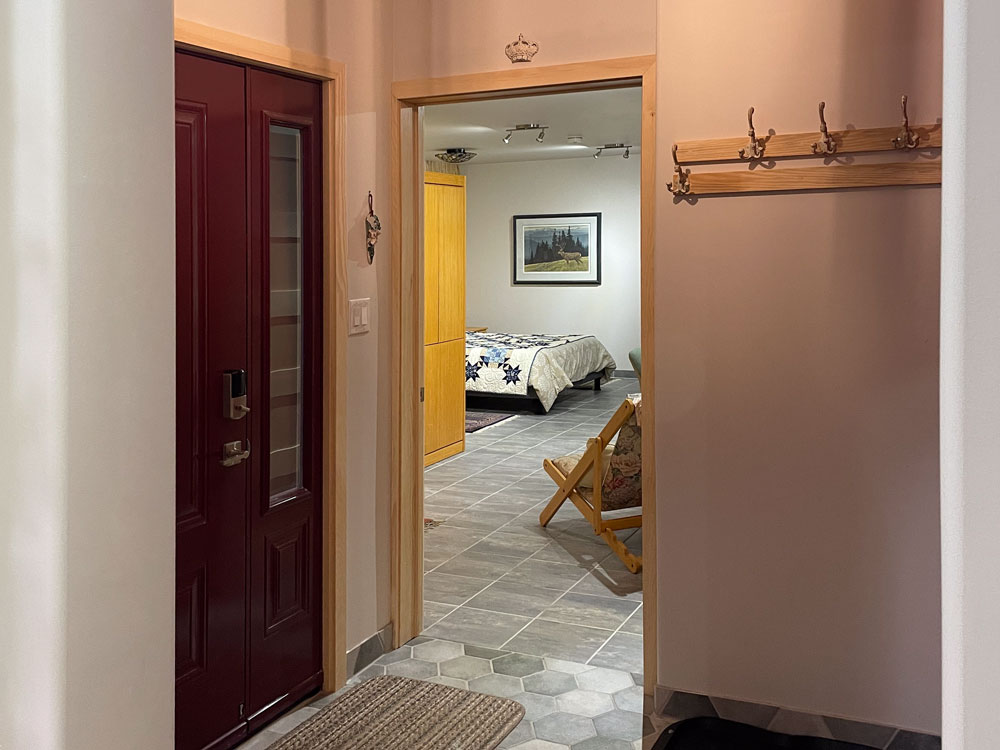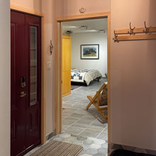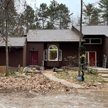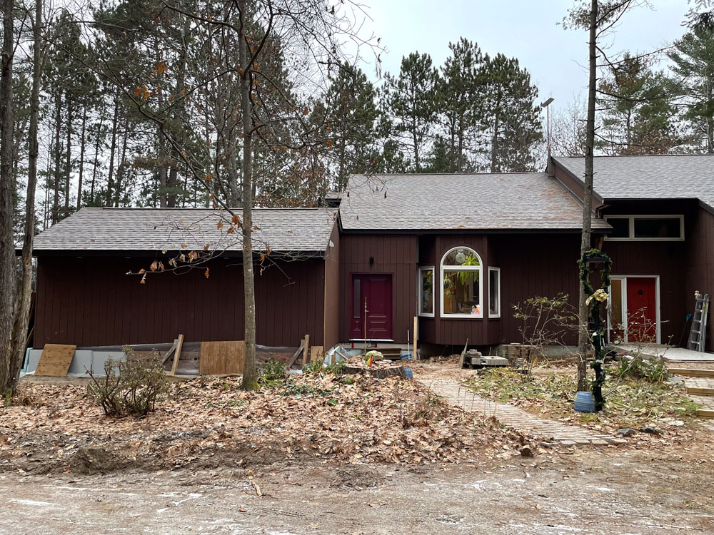 Meanwhile, we had started into a project of our own. When the snow finally melted in the spring, construction began on our new guest suite. Despite having a lot of open-concept floor space, we lacked a second bedroom with walls and a door. We do have relatively comfortable guest space on our mezzanine, but it isn't as private or dignified as our senior guests might like, and there is no bathroom. So, we have added a second bedroom with a bathroom connected to the house with a second vestibule. Our builder is dealing with a few final details outside...as the snow begins. It has been a full three-season project and we did much of the interior finishing (painting, tiling, shingling) ourselves. And if that wasn't enough, Andrew rebuilt two rotting decks with Tanzite stone decking and Leslie repainted the entire exterior. Whew!!!