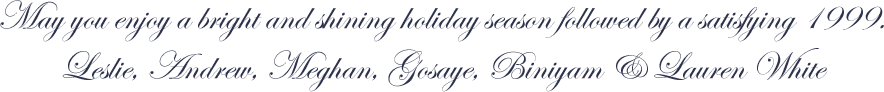 taxi driver. On the streets, children and beggars looking for handouts swarm foreigners. One can not The trip home was a grueling 30 hours, with a 4-hour stopover in Frankfurt, and a final 6-hour drive from Toronto to Deep River. The boys alternated between periods of sleep and wide-eyed fascination with the technologies of travel. Once through immigration in Toronto (where Andrew found that there are some compassionate people in our bureaucracy, pleased to quickly process the necessary paperwork), Biniyam and Gosaye were quick to take to Andrew’s parents who had kindly offered to chauffeur for the final leg. We both found their arrival in Deep River to be an emotional culmination to a long roller coaster ride through the international adoption process. Since arriving home, Biniyam and Gosaye have been adapting rapidly, learning our expectations and fitting themselves into our family life quite nicely, thank you. They started kindergarten in their second week. Gosaye, who is old enough for grade one, attends full-time and loves it. He wakes up on weekends and asks to go. Biniyam attends the usual half-time schedule and likes it reasonably well. Their teacher has been quite delighted by their enthusiasm, quick wits and ability. Biniyam can identify half of the alphabet in both upper and lower case. Gosaye, with his language receptors wide open, has picked up quite a bit of French in his daily forty minutes and speaks more French in class than the teacher has actually taught. The girls have welcomed these new additions to the family with amazing grace. Meghan (6), now in grade one, is having such a nice year that war could be declared without fussing her much. She has learned how to read which has encouraged her to feel quite grown up, as none of her siblings can do that yet. She continues to enjoy any artistic pursuits and is enrolled in after-school art classes with a local artist where she is able to explore a wide variety of media and techniques. To round out her busy life, she enjoys Sparks (pre-pre-Girl Guides) and gymnastics weekly and plans to try her hand (or feet?) in the JackRabbits cross-country ski program after Christmas. Lauren (3) has started Nursery School and is now able to let Leslie be away from time to time. She is quite an outgoing gal and amuses her Nursery School teachers with her imaginary games and pronouncements on life. She has quite a bit to say and usually says it in a remarkably big voice for such a small child. She also enjoys gymnastics, which at her age is still a parent-participation-sport. Leslie has pared back her activities to a bare minimum and still seems to be busier than possible with the care of four children. The days whiz with little seeming to be accomplished, however the kids are dressed, fed and reasonably content. It’s all a question of how one measures success. She’s hung on to her La Leche League commitments and continues to co-lead the local group. She finds the support received through her involvement, coupled with the satisfaction of helping new mothers breastfeed, are well worth the time she puts into it. Her sewing room is a place she longs to spend more time, although when she sneaks away to hide there, the kids seem determined to keep her company. She shamelessly admits that she looks forward to a day when they are all in school simultaneously, although she spends volunteer time in each of their classrooms. Andrew has found his new job managing an R&D group in a time of shrinking funding to be quite challenging and time consuming. He spends a fair bit of time communicating with internal and external customers, which involves frequent trips to Toronto. On some of these trips, the family has been able to tag along and visit Andrew’s parents and brothers in the Toronto area. Andrew has also made a number of trips to France and Italy to attend meetings on international research projects. While these trips can be quite interesting, the time away from the family, and the growing pile of paper at the office, makes them less fun than they would be otherwise. Outside of work, Andrew has enjoyed completing several projects around the house including putting the finishing touches on Leslie’s sewing room. He has also continued to participate in some scouting activities, but on a much smaller scale since leaving Manitoba.